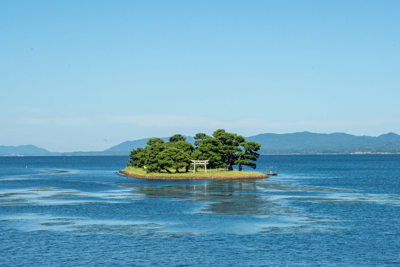滋賀県には日本最大の琵琶湖があり、島根県には日本で7番目の大きさを誇る宍道湖がある。琵琶湖には西国三十三所観音霊場の竹生島が浮かび、弁才天信仰の聖地として古来より崇敬を集めている。宍道湖の嫁ヶ島には弁財天を祀る竹生島神社(堀尾吉晴勧請・異説あり)がある。鳥居は、明治40年(1907)に琵琶湖疏水設計者の田邉朔郎が寄進したものである。奇跡のような縁である。
